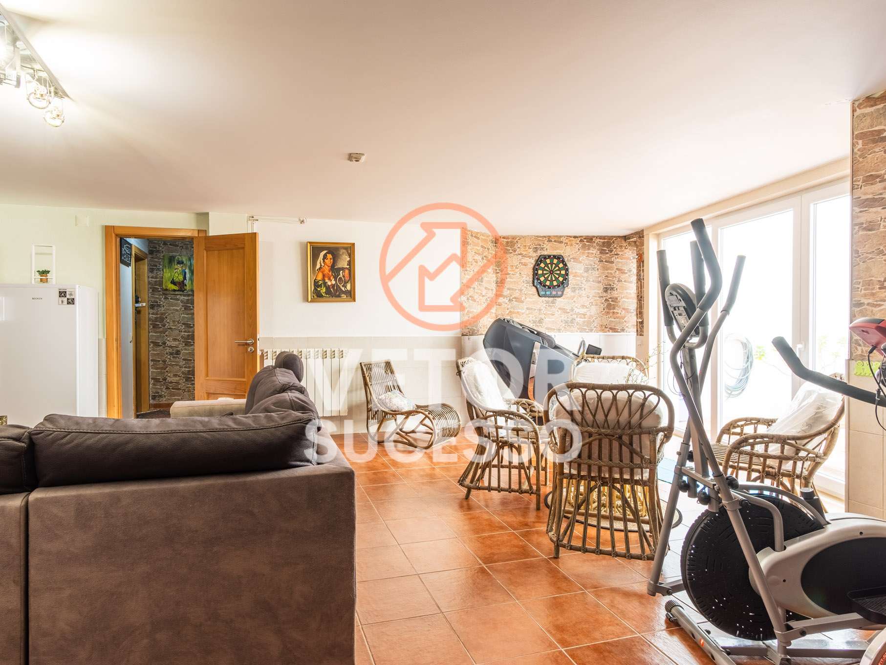 A garagem, transformada num amplo salão de festas, está pensada para convívios memoráveis com a família ou os amigos, garantindo a privacidade do resto da casa.