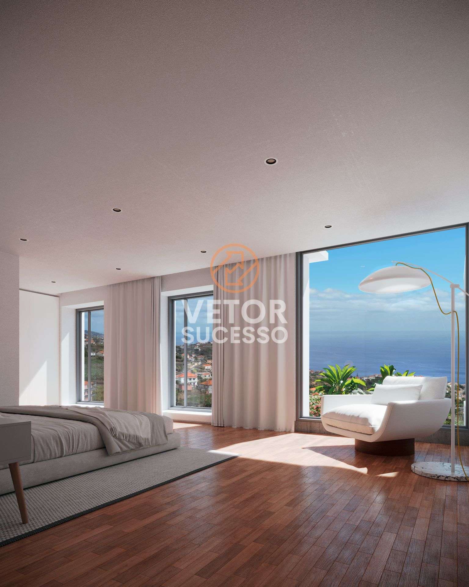 Entramos na moradia e encontramos as salas de estar e jantar integradas com a cozinha com o objetivo de uma vivência partilhada. As janelas de grandes dimensões trazem a natureza para dentro da moradia e criam telas com uma vista fantástica para o oceano atlântico. É também neste piso que encontramos um terraço e uma piscina de 10m por 6m , com uma zona para espreguiçadeiras.